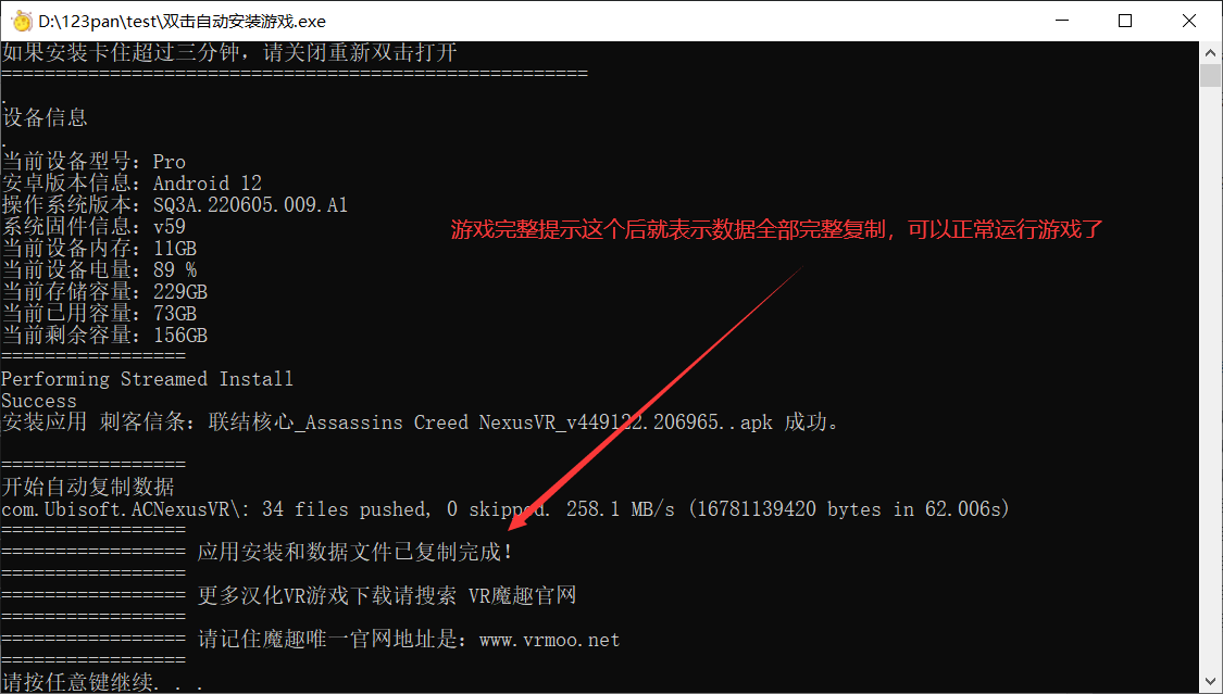 - 把 安装程序 放到需要安装的游戏文件夹内,双击就可以自动批量安装APK包和OBB数据文件,并在安装完成后显示设备信息状态。